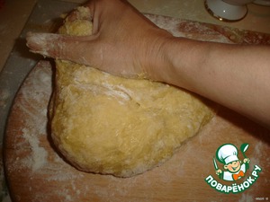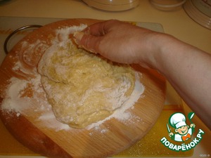 Получается липкое тесто, которое мы выкладываем на посыпанную мукой поверхность. Начинаем отбивать его.
