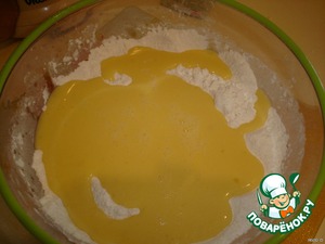 Сделаем лунку в середине муки и добавим ПОСТЕПЕННО слегка взбитые яйца (добавляя постепенно, замешивайте потихоньку тесто).