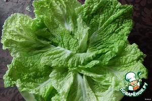 Вымыть и высушить листья кит. капусты, вырезать твердую их часть, выложить на блюдо. Можно использовать и салатные листья.