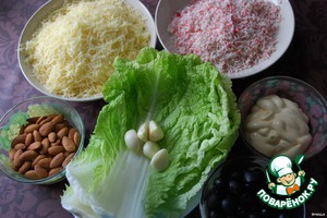Из сырной массы формируем шарики. Размер выбирайте сами, но хочу заметить, что выход продукта не большой, поэтому, если у вас будет много гостей, то не стоит их делать крупными. Делаем в них углубление, вставляем туда маслину с миндалем, залепляем. Готовый шарик обваливаем в тертых крабовых палочках и выкладываем на блюдо.