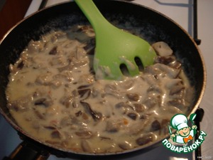 • В сковороду с грибами влить молоко, добавить сыр и на медленном огне проварить до получения однородной массы из молока и сыра.