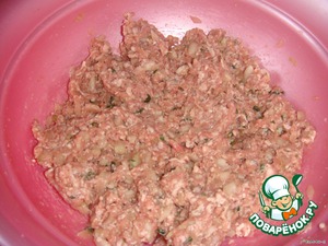 Готовим начинку: фарш, лук (мелко порезать), зелень, лук зелёный (измельчённый), перец, соль, приправу, 0,5 стак. воды, всё хорошо перемешать.