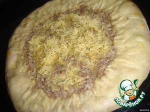 Когда чебурек начнёт чуть румяниться, посыпьте тёртым сыром и поставьте обратно в духовку допекаться.