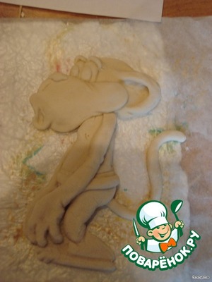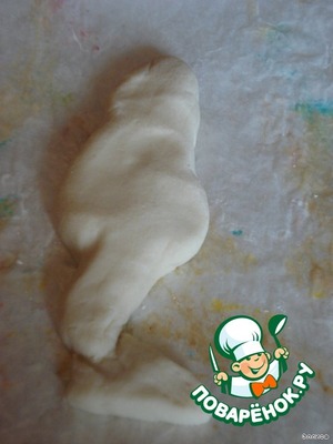 Как и в предыдущих рецептах начинаем работу с замешивания теста, для чего хорошо перемешиваем муку, сахар, соль, к смеси добавляем воду и растительное масло и вымешиваем до однородной массы. Из готового теста начинаем работу над фигуркой с тельца.