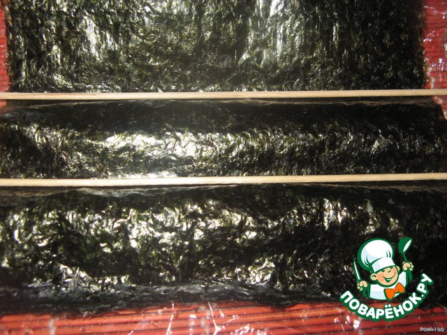 Сверху укладываем ещe один лист нори и , с помощью палочек , прижимаем его в междурядья риса.