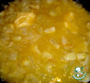 В сковороде растапливаем сливочное масло, отправляем туда крупно нарезанный лук