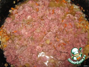 Пассируем лук, морковь, добавляем фарш и обжариваем до золотистого цвета.