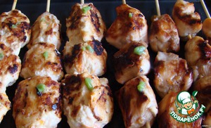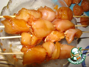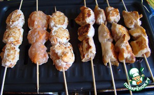 Кусочки курицы и тефтели нанизываем на шпажки по три штуки.(Тефтели нанизываем мокрыми руками.Куриный фарш жиже обычного.Поэтому тефтели должны быть небольшими)