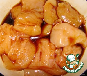 Готовим маринад.2 ст. ложки соевого соуса+1 ст ложку вина+1 ст ложку сахара смешиваем. и погружаем в маринад кусочки курицы.Оставляем на 30 минут мариноваться