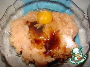 Оставшуюся курицу пропускаем через мясорубку.Добавляем 1 ст ложу соевого соуса+яйцо+1 ст ложка сахара