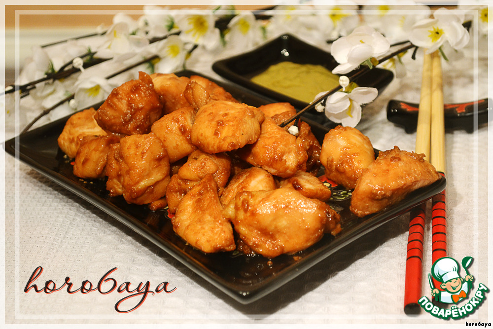 Когда курица готова на каждый кусочек капните немного васаби,затем размажьте его ложкой (или пальцем))))смоченной водой и подавайте к столу посыпав зеленью