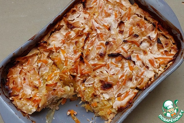 5 -ое: Выложить в форму половину капусты, смазать сметаной;