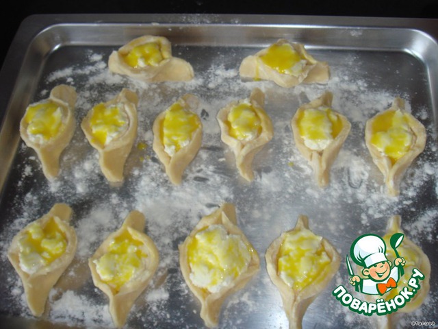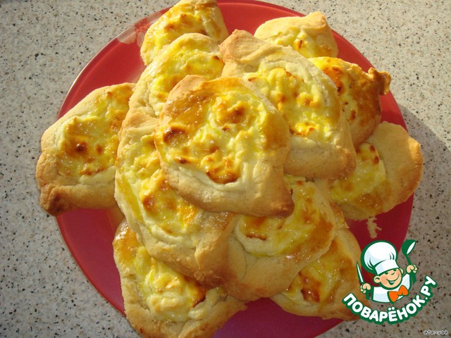 • На середину кружков выложить творог и по бокам защипнуть. Смазать желтком и выпекать при 200 градусах в течении 30-40 минут до румяного цвета.