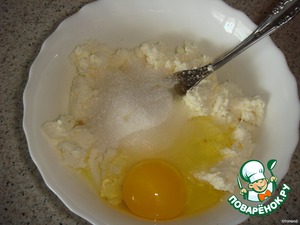 • Творог смешать с яйцом и сахаром (50гр.).