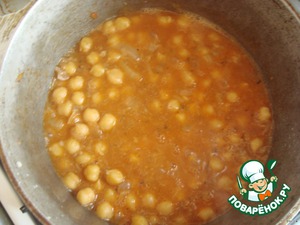Готовим подливу: предварительно замоченный на ночь нут отвариваем до готовности. Обжариваем в маленьком чугунке мелко нарезанный лук, пока он не станет прозрачный. Добавляем туда томатную пасту, горох и 2 ст.л. мясного фарша. Заливаем это всё горячей водой, добавляем специи и красный молотый перец. Тушим 5-7 мин.