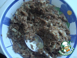 Остывшие фарш и лук перемешиваем и добавляем 2 ч.л специй.