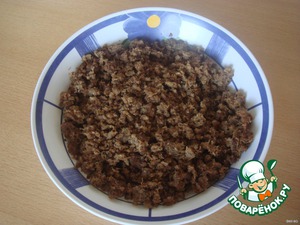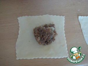 На каждый квадратик выкладываем получившийся фарш размером с грецкий орех.