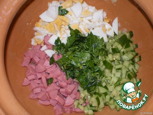 Затем добавляем резанный огурец, измельчённые яйца, сосиски (колбасу, мясо). Мои домашние любят аромат зелени в окрошке, и для этого я зелень измельчаю, посыпаю солью и растираю толкушкой (как картофель), пока она не пустит сок. Далее добавляю квас и всё перемешиваю, обязательно кладу хрен (можно и со свеклой) побольше (мы так любим). Пробую на соль, если необходимо - подсаливаю. Ну вот и готово! ПРИЯТНОГО АППЕТИТА!!!