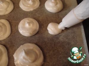 Выкладываем белковую массу на противень,застеленный промасленной бумагой.Подсушиваем их при температуре 80 гр. в течении 2-5 часов.Готовые меренги должны быть хрупкими по всему объему.Охлаждаем готовые меренги.