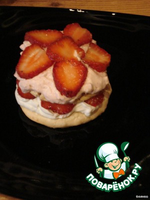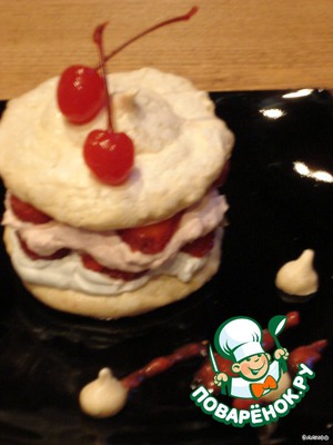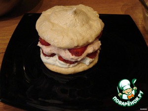 Сверху клубники кладем меренги, на них выкладываем полученный крем и нарезанную клубнику.