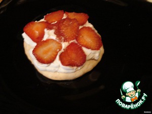На меренги раскладываем взбитые сливки,а на них - нарезанную клубнику.