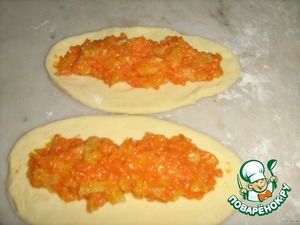 Курагу нарезаем кубиками и смешиваем с морковью, натертой на тёрке (или порезанной кубиками). Добавляем сахар лучше по вкусу, всё зависит от Вас. Начинку попробуйте - может сахар и не нужен будет вообще. Я положила100 грамм.