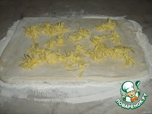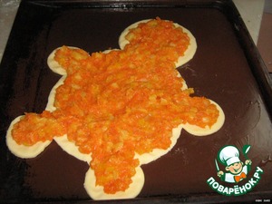 Выкладываем зайку на противень, на все части тела выкладываем начинку оставив пол сантиметра что-б защипать края.