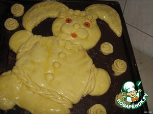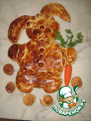 "Загореленький зайчонка в коротенькой юбчонке". Обалденный вкус, когда на работе сказала что буду выпекать пирог с морковью все сказали ФУУУУУУУУ. Но когда зайка выпрыгнул из печки, мои дегустаторы были за столом и отрезали маленькие кусочки просто для пробы. Но когда распробовали стали отламывать у зайки ножки, ручки, ушки. Советую попробовать. И хотелось, чтоб малыш занял не последнее место в конкурсе. На конкурс "В мире животных".