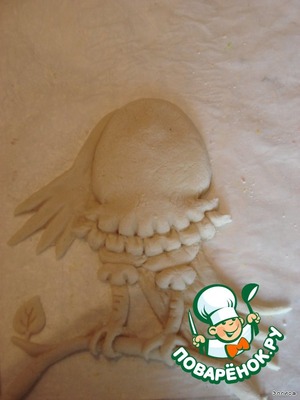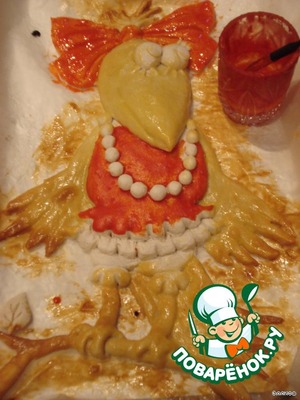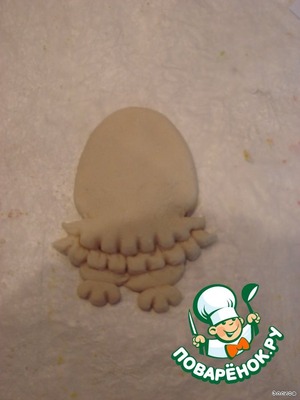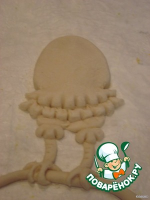 Как и в предыдущих рецептах начинаем работу с замешивания теста, для чего хорошо перемешиваем муку, сахар, соль, к смеси добавляем воду и растительное масло и вымешиваем до однородной массы. Из готового теста начинаем работу над фигуркой с изготовления платья.