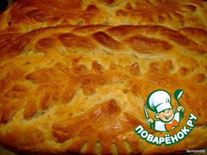 • А теперь, накрываем слоем теста начинку, скрепляем края, смазываем яйцом, выкладываем всякие украшательства, смазываем их тоже, и в разогретую духовку. Температура 200 гр. Выпекаем до золотистой корочки около 35-40 минут.