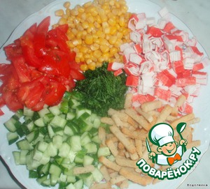 Дальше, по кругу выкладываем остальные наши продукты (огурцы и помидоры порезать средними кубиками).