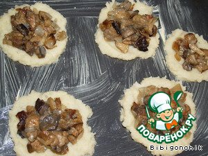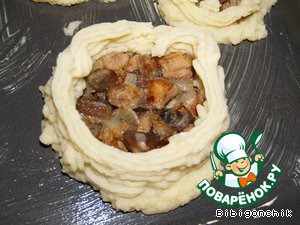 Из отварного картофеля сделать пюре. Картофель протереть через сито, добавить молоко кипяченое, яйцо. Все хорошо перемешать. С помощью ложки на смазанном малом противне сделать дно гнездышек.Затем кладем грибы.