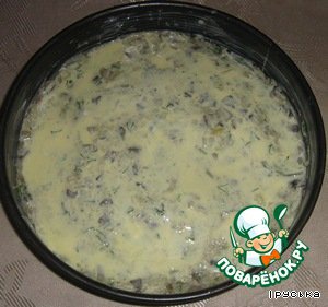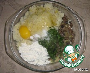 Соедините картофель, лук и грибы, добавьте яйцо, сливки, муку, соду, зелень, соль. Массу перемешайте, выложите на смазанную маслом форму.