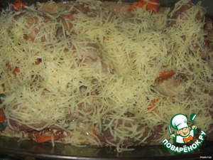По прошествии времени, форму вынимаем, голени переворачиваем, посыпаем натертым сыром и отправляем в духовку ещё минут на 10 .