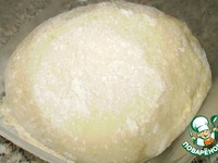 Тесто делим на 2 части (одна поменьше-на жгуты), большую часть раскатываем, кладём в предварительно смазанную форму, так чтобы края приподнимались, посыпаем крахмалом. |