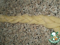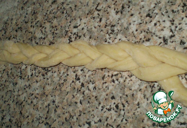 Сверху пирог украшаем жгутами из теста в виде сеточки, для края я сплела такую косичку. |