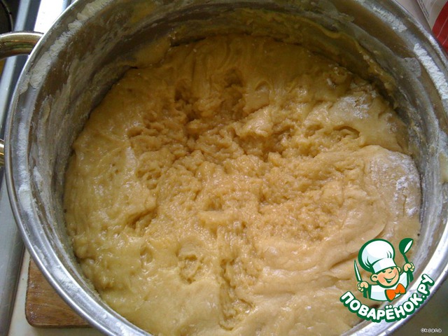 • Снять с огня, дать немного остыть, затем добавлять муку в теплую массу пока тесто не перестанет приставать к рукам, но должно оставатся мягким.