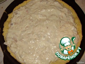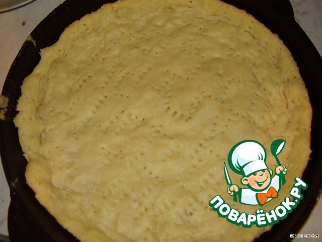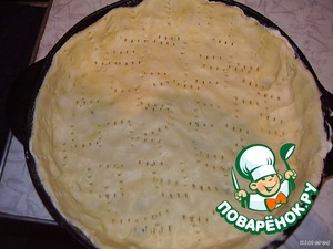 Форму смазать растительным маслом, 2/3 части теста тонко раскатать, наколоть вилкой и выпекать в разогретой духовке при 180-200 градусах 25 минут.