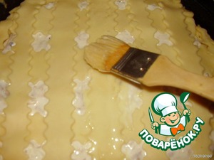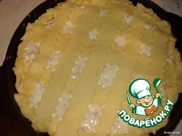 1/3 теста тонко раскатать и нарезать фигурным ножом полоски, уложить сверху косой решеткой.