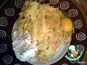 • Очищенный картофель натереть на крупной терке, добавить яйцо и муку и хорошо перемешать в миске.