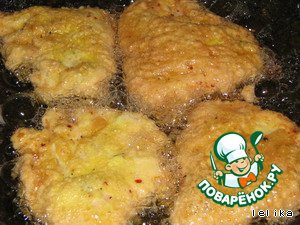 Обмакиваем кусочки в кляр и обжариваем в раскаленном масле.