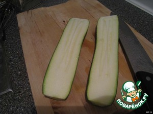 Разрезать кабачок вдоль на 2 равные части. Можно также немного срезать снизу, для устойчивости.