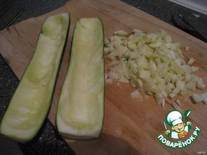 Мякоть нарезать мелкими кубиками. Половинки цуккини немного посолить. -