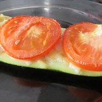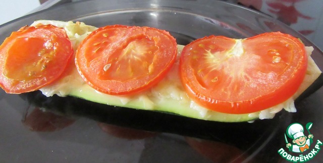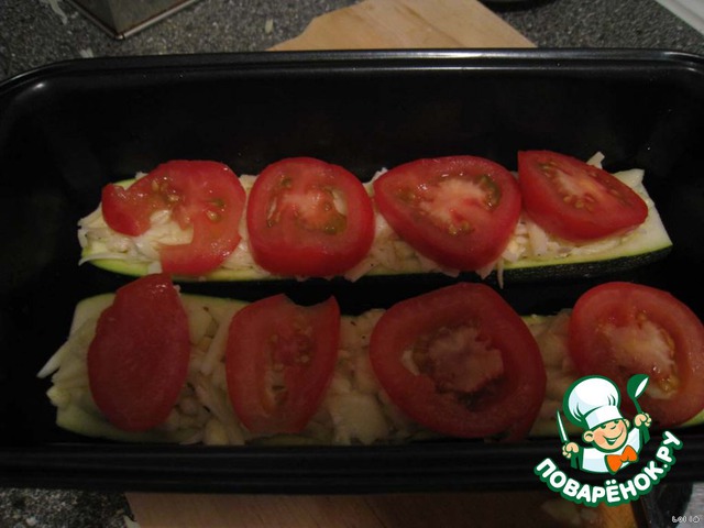 Помидоры порезать кружочками, положить на цуккини, выложить в форму для запекания и отправить эту красоту в духовку.