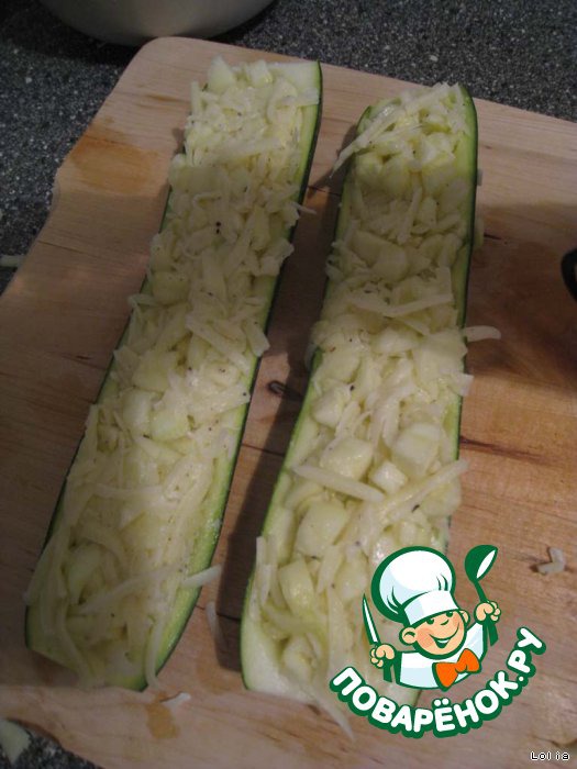 Смешать порезанную мякоть цуккини с тертым сыром, посолить/поперчить и "нафаршировать" этим половинки.