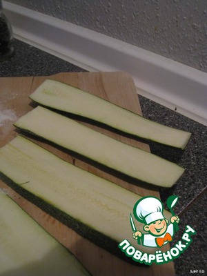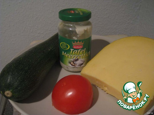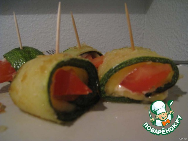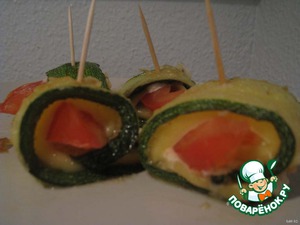 на горячий кабачок положить сыр,намазать хреном, положить небольшой кусок помидорки и быстро всё скатать.Закрепить зубочисткой. Небольшая сложность заключается в том, что кабачок надо скатывать пока он не остыл, для того, чтобы расплавился сыр. Но если приноровиться, используя подручные средства, то совсем не сложно. -