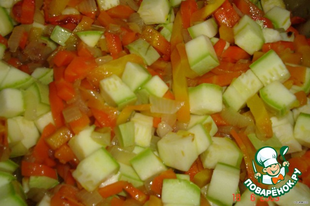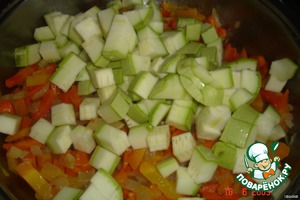 Кабачок нарезать кубиком и добавить к овощам.