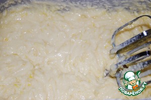 • Сахар и масло положить в миску и смешать. Постепенно ввести в смесь, желтки, цедру и лимонный сок.