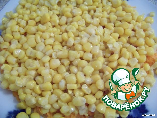 • 2 слой – банка кукурузы. Сверху выдавливаем сок половины лимона (это обязательно; иначе будет совсем не то!)