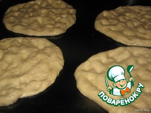 Когда поднялось, делим тесто на 4 части, и, смазанными растительным маслом руками, формируем лепёшки и укладываем их на противень, также смазанный маслом. На поверхности лепёшек, пальцем, делаем углубления.